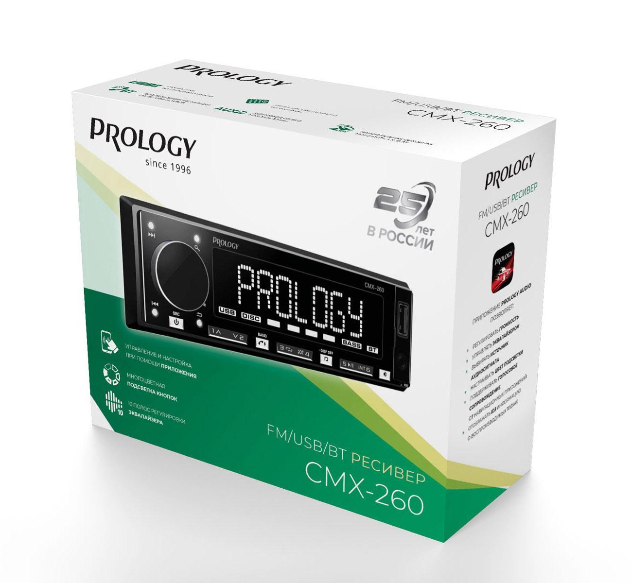 PROLOGY CMX-260 — FM / USB ресивер с Bluetooth®, стандартного размера 1DIN, который обеспечивает прием радиостанций в диапазоне FM и воспроизведение медиафайлов MP3, WAV, и FLAC форматов, записанных на USB накопители, передачу звука с внешних источников через линейный аудиовход и беспроводной интерфейс Bluetooth®. Поддерживается управление мобильным телефоном через интерфейс Bluetooth® (ver. 4,2).